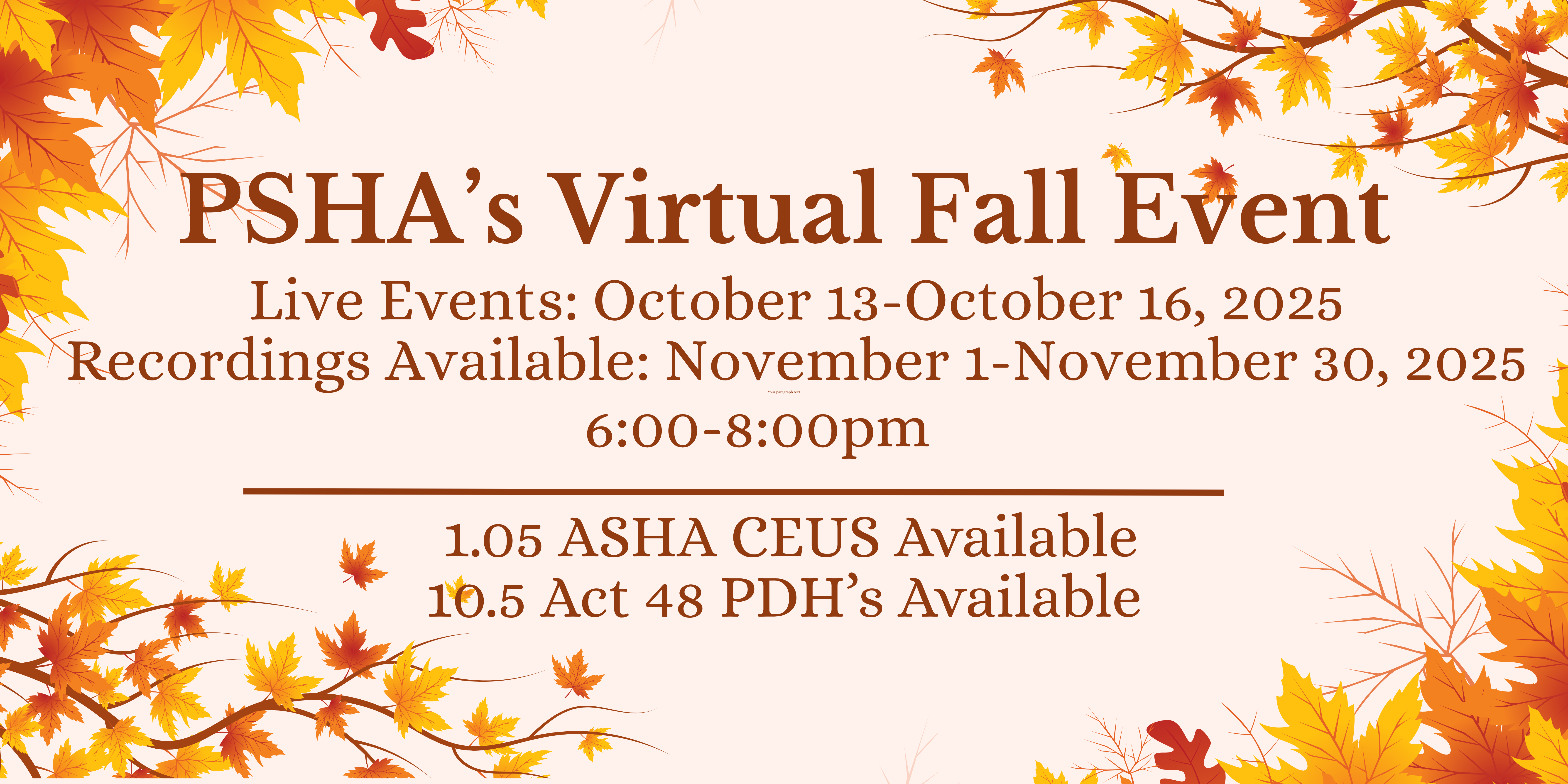 Fall Event Join us this October 13th-16th for our annual virtual fall continuing education event. Available for 1.05 ASHA CEUs and Act 48 credits! Register Now!
